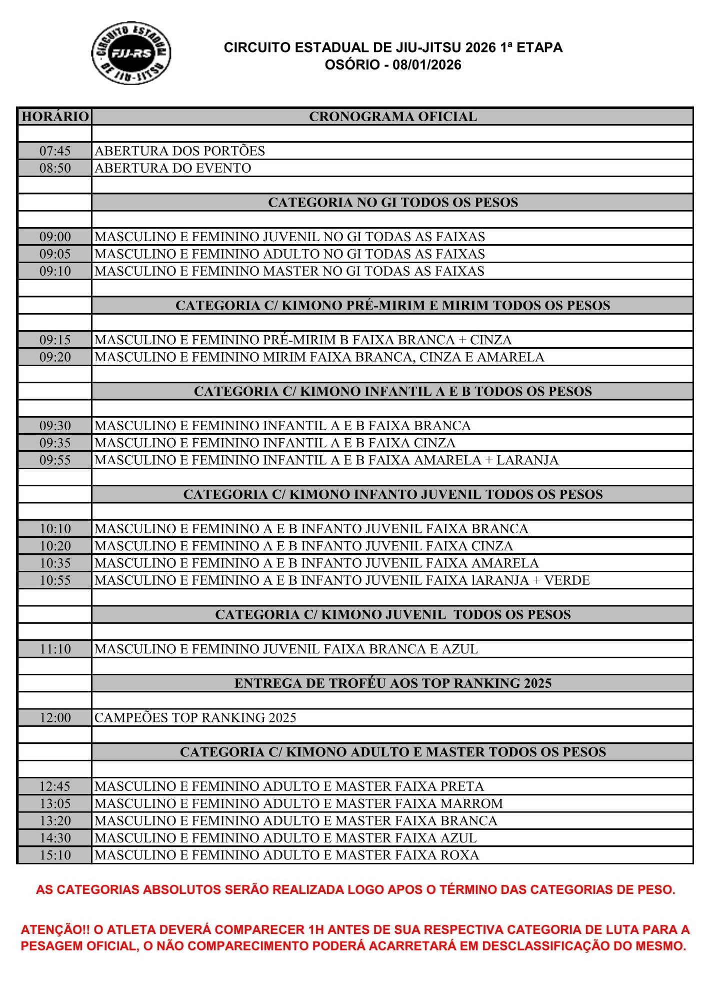• O atleta deve estar presente no ginásio 1 hora antes do inicio da sua categoria.
