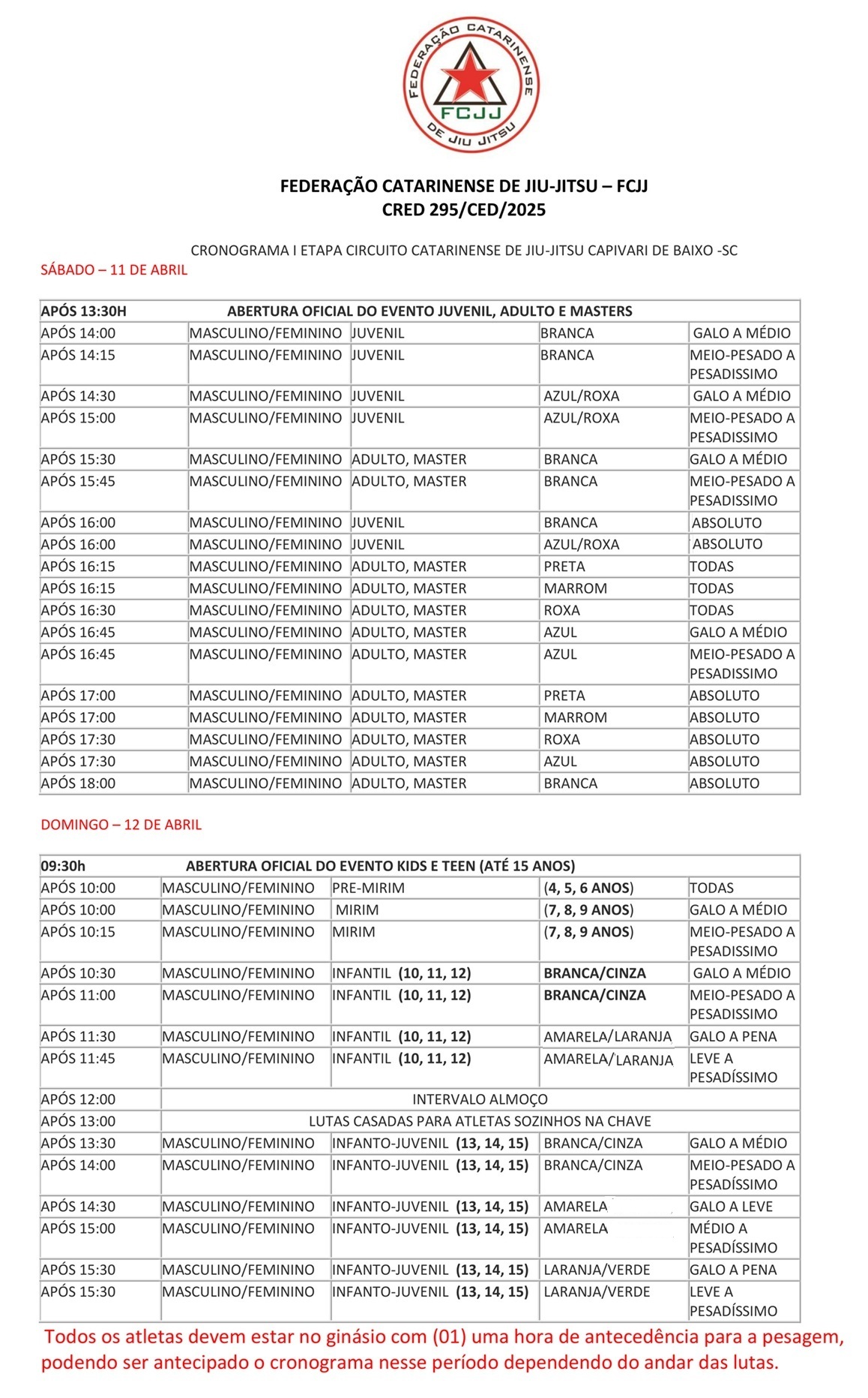 O atleta deve estar no local 1 hora antes da respectiva categoria, seguindo o cronograma de lutas.