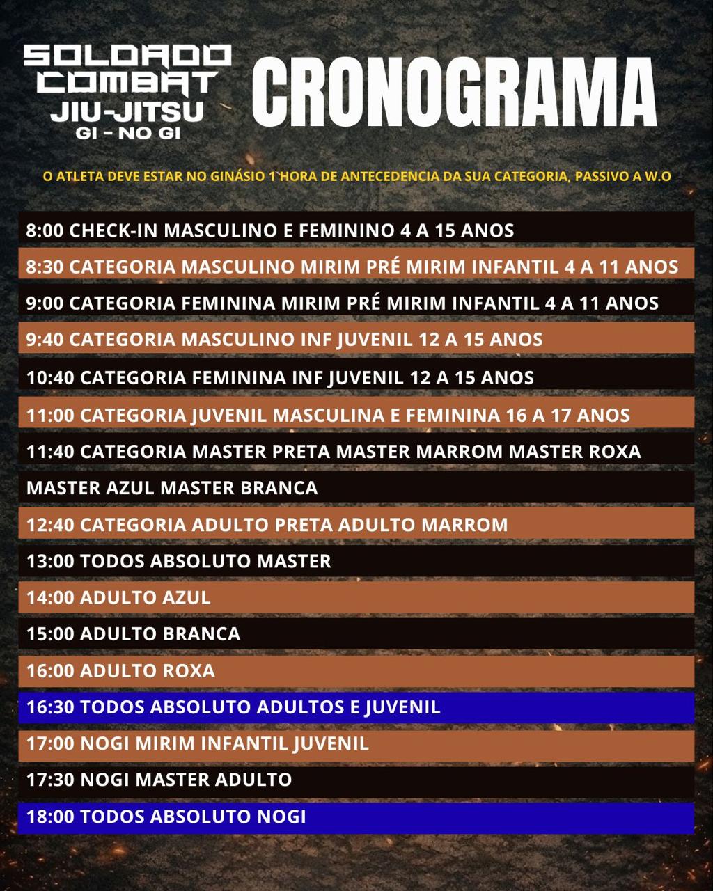 AGENDA/SCHEDULE => Onde o atleta pode acompanhar os prazos de inscrição, pagamento, checagem geral, publicação de cronograma/chaves de luta)