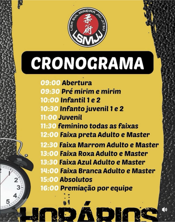 O atleta deve estar no local 1h antes da respectiva categoria, seguindo o cronograma de lutas.