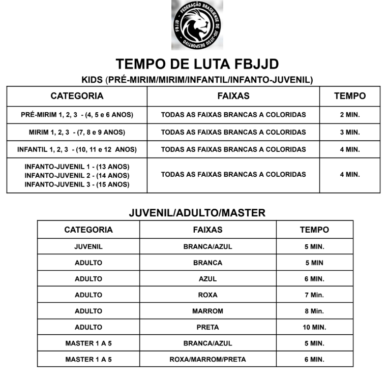 Haverá disputa para faixas AZUL, ROXA, MARROM e PRETA (Adulto e Masters).