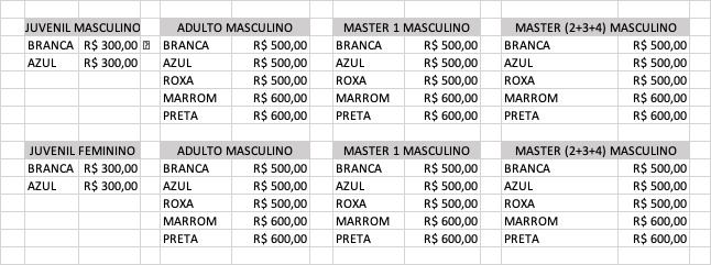 TABELA DE PESO => Informações e regras sobre as categorias e idades disponíveis para inscrição no evento, ou seja, quais os perfis de competidor poderão se inscrever.